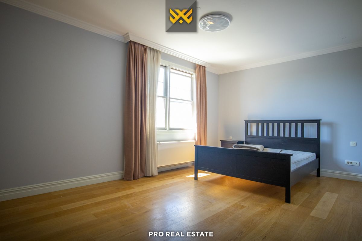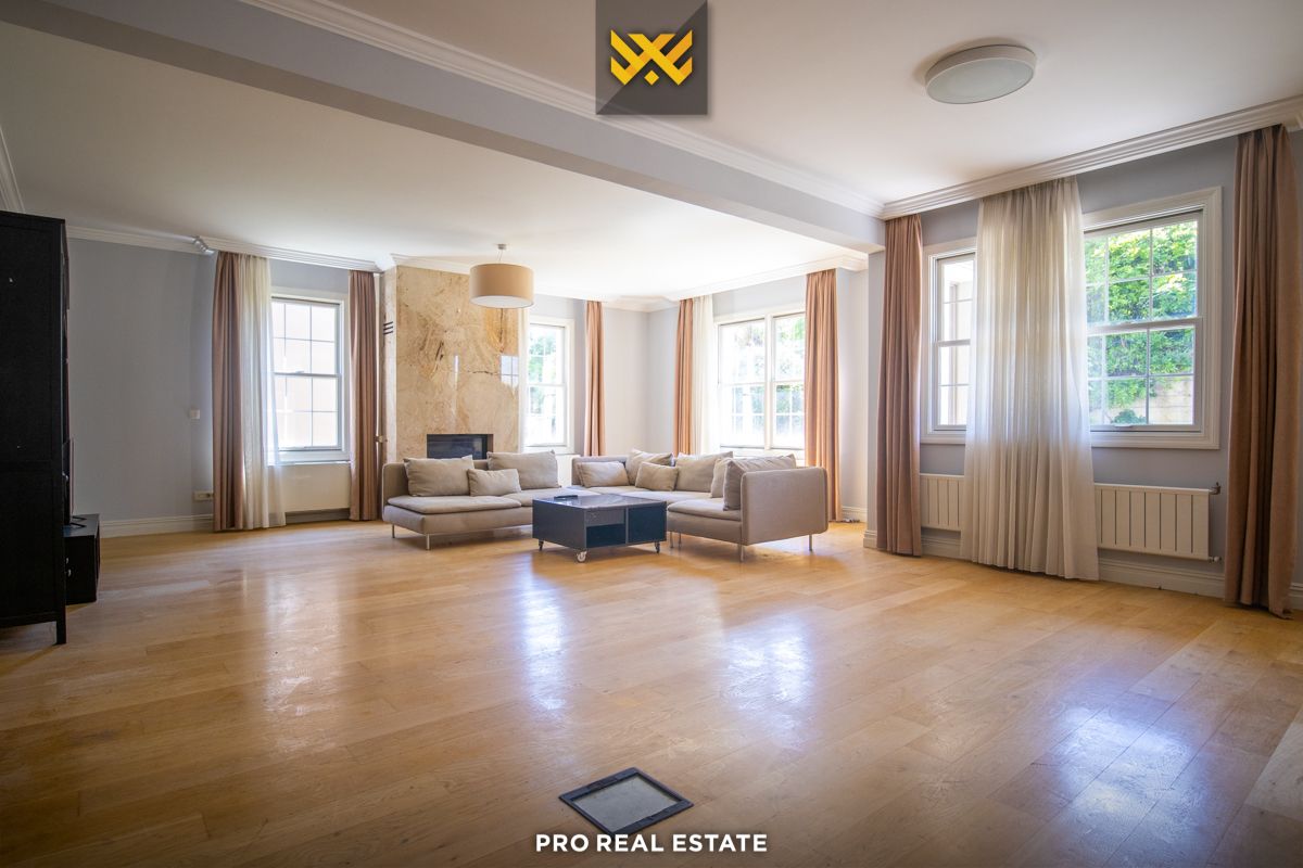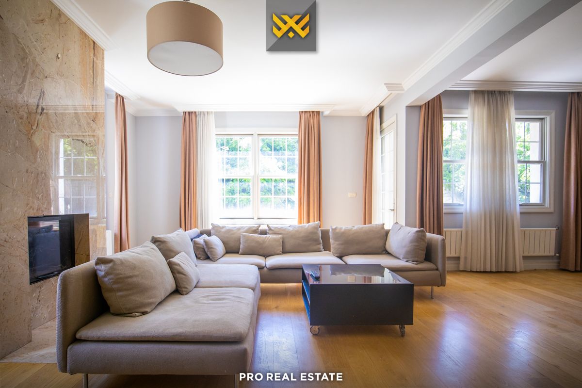 The house is designed with a basement and two floors, has orientation from all sides thus providing ample natural light for all interior spaces and has the following layout of interior spaces: living room, kitchen, four bedrooms, and five bathrooms.