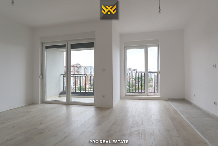 The apartment has a southern and western orientation and has the following layout of internal spaces: living room, kitchen with dining area, two bedrooms, one bathroom, and a balcony.