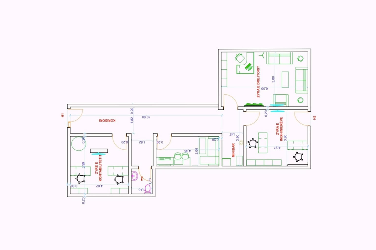 The space has an orientation towards the east and south, featuring four large usable areas suitable for an office and a bathroom.