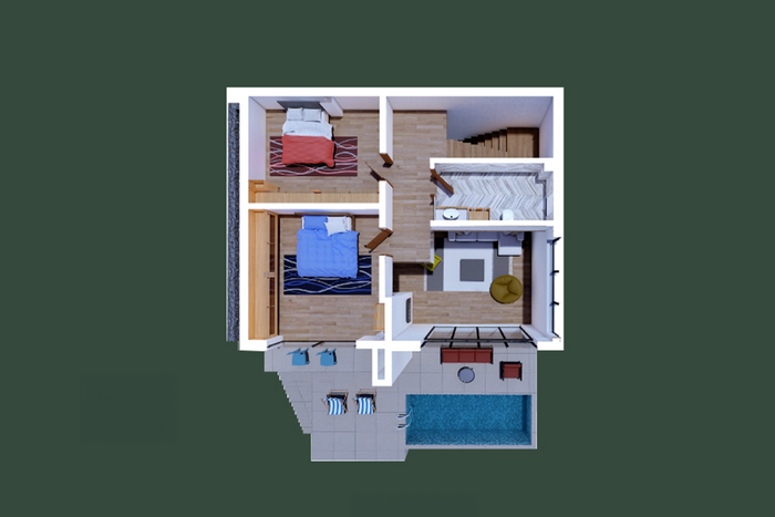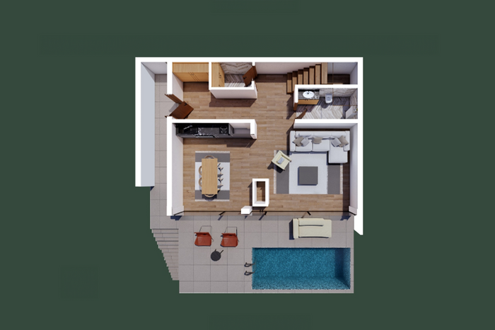 On the ground floor, there is a living room, kitchen, bathroom, storage, and access to the terrace and pool;