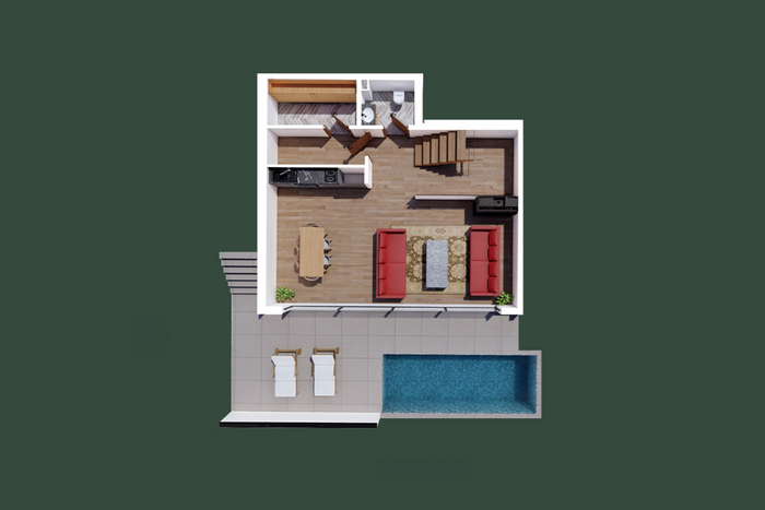 The villas are oriented from all sides, thus providing natural light throughout the day and in all spaces. They have the same organization with this arrangement of internal spaces: living room, kitchen with dining area, bathroom, toilet, storage, three bedrooms, and access to the terrace and pool.