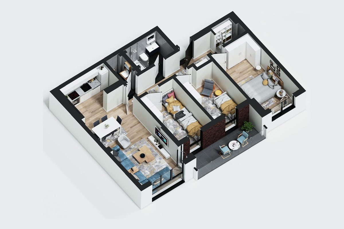 The apartment has the following layout of internal spaces: living room, kitchen, three bedrooms, one bathroom, toilet, storage, and a balcony.