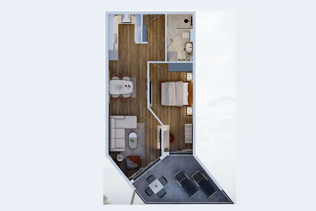 The apartment has a west and south orientation and features the following layout; living room, kitchen, one bedroom, bathroom, and a balcony.