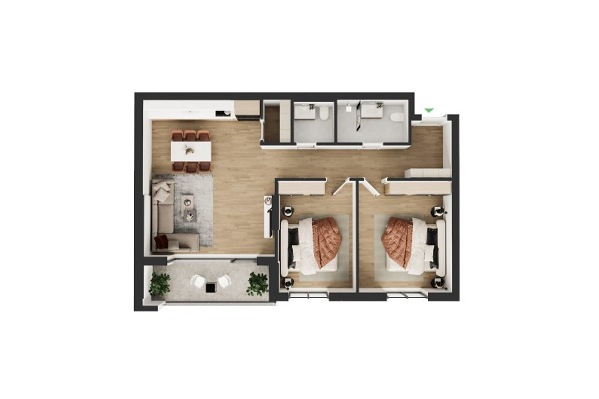 The apartment has the following layout of internal spaces: living room, kitchen, two bedrooms, one bathroom, toilet, storage, and balcony.