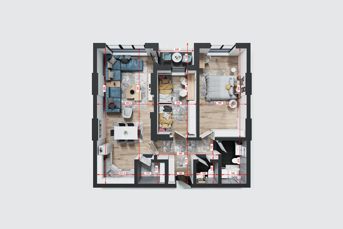 The apartment has an east and south orientation and has the following layout of internal spaces: living room, kitchen, two bedrooms, one bathroom, toilet, storage, and a balcony.