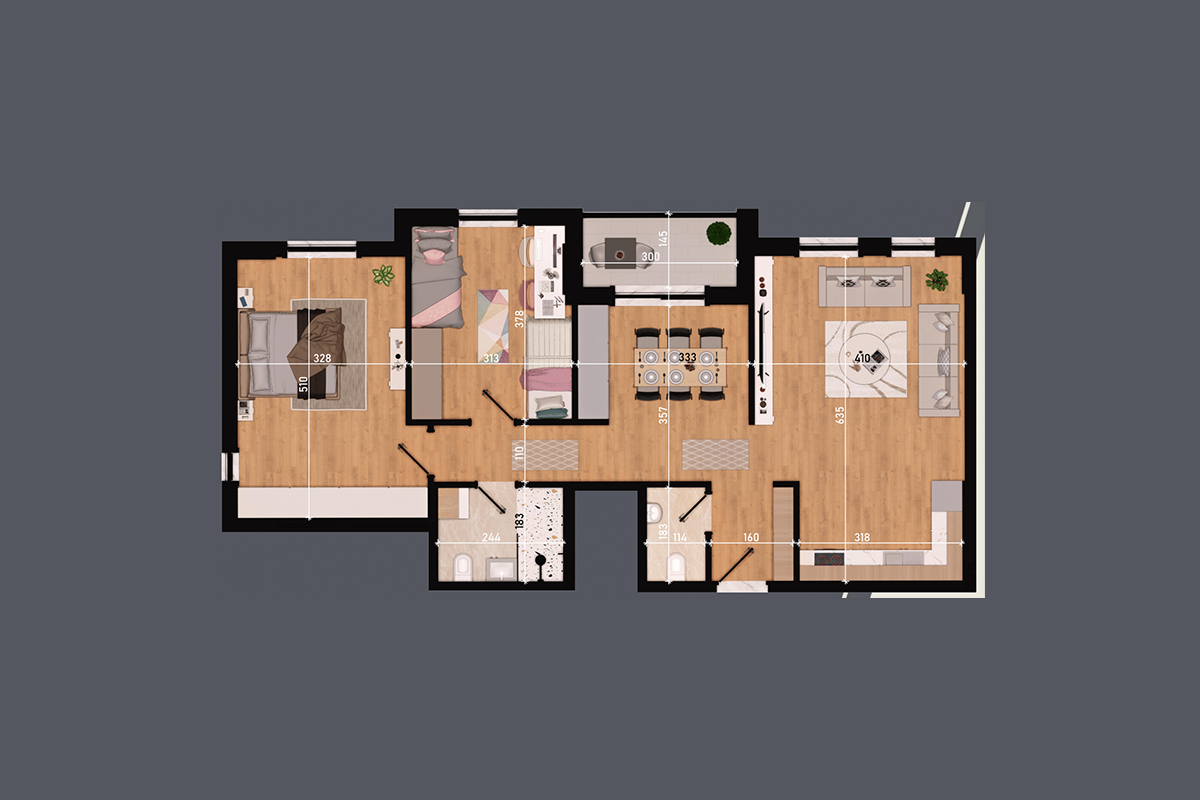 The complex has quality investments, triple-glazed aluminum windows, Italian Diere doors, and room doors from the Binni company with a height of 2.60m.