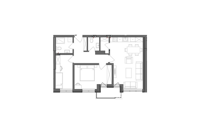 The apartment has a western and southern orientation and has the following layout of interior spaces: living room, kitchen, two bedrooms, one bathroom, toilet, storage, and balcony.