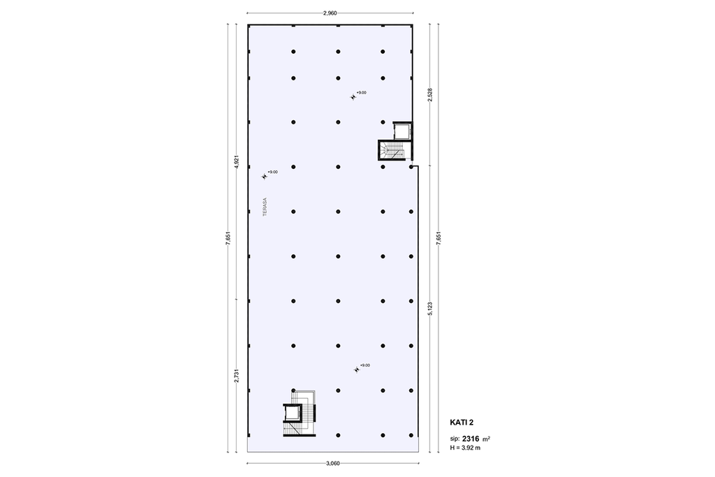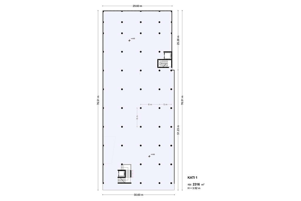 Përdhesa ka gjatësi në të dyja anët 73.83m² dhe gjerësi 29.60m², ndërsa kati i parë gjatësi prej 73.83m² dhe gjerësi 30.60m². Kati i dytë ka sipërfaqe për nga gjatësia 7.651m² dhe për nga gjerësia 2.960m², në të përfshihet edhe një terasë. Objekti në shfrytëzim ka dy garazha me hapësirë shumë të madhe parking, si dhe ka dy hyrje. Çmimi është 6€ për m². Objekti përfundon në fund të 2022.