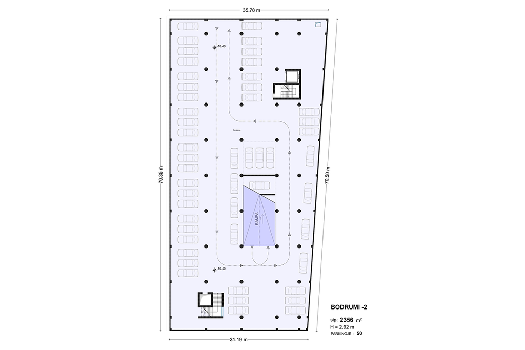 Secili kat ka metrazhë të ndryshme dhe strukturim të veçantë, duke filluar nga bodrumi -2 me gjatësi nga njëra anë 70.35m², ndërsa ana tjetër me 70.50m², kurse me gjerësi nga njëra anë 35.78m² dhe ana tjetër 31.19m², duke vazhduar me bodrumin -1, i cili ka gjatësi në njërën anë 92.40m² dhe anën tjetër 70.50m²+21.10m², ndërsa gjerësinë nga njëra anë 31.19m² dhe ana tjetër 29.60m². Sutereni ka metrazhë për nga gjatësia në njërën anë 76.51m² dhe ana tjetër me 43.32m²+33.28m² ku përfshin dy depo, ndërsa me gjerësi 31.16m².