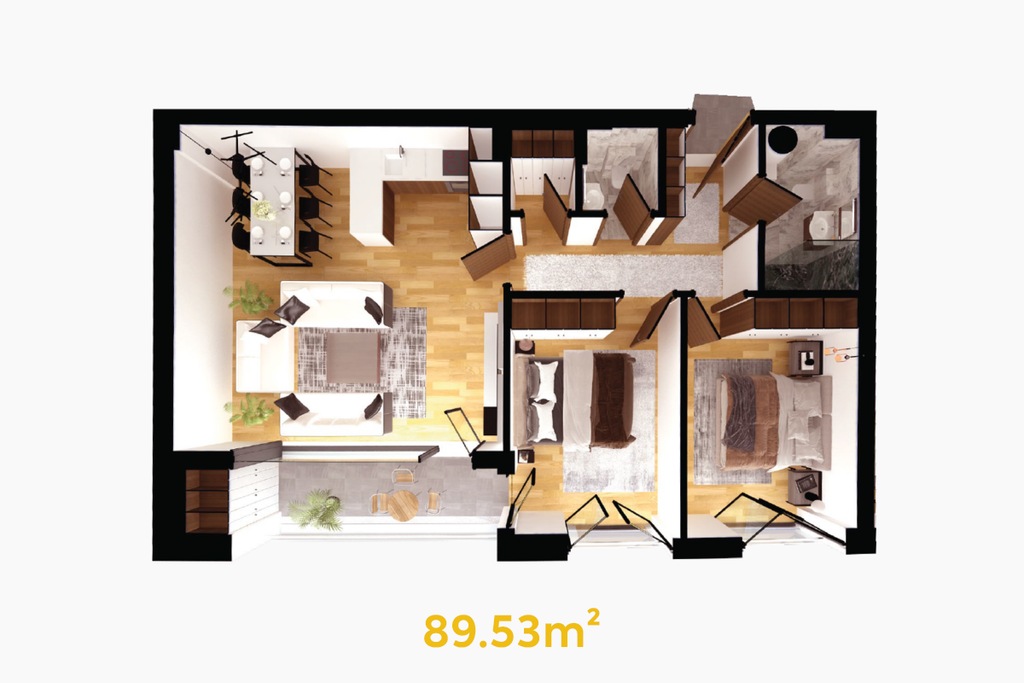 Banesa është e renditur në këtë mënyrë: qëndrim ditor, kuzhinë, dy dhoma të gjumit, një banjo, një depo, një tualet dhe një ballkon.