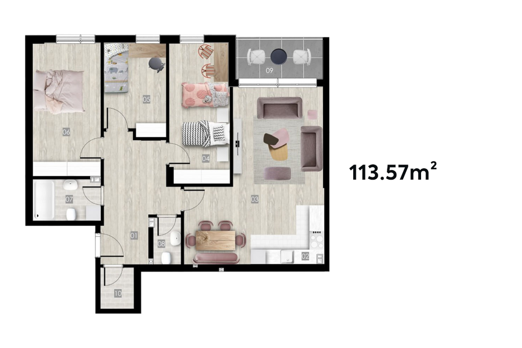 The apartments with various sizes are located in Prishtina e Re, on "Holger Petersen" street, built by Condor SH.P.K., in the Dora complex, with a distance of 450m from the QKUK hospital, 250m from Albi Mall, and 600m from the Basic Court of Pristina. The Dora complex offers high and unique comfort in terms of your family's relaxation and tranquility. In Lamela C, there are three different apartments, with sizes starting from the apartment of 109.95m², which is arranged as follows: a living room together with a kitchen and dining area, three bedrooms, one bathroom, one toilet, and one balcony, the apartment of 108.94m² with a living room together with a kitchen and dining area, three bedrooms, one bathroom, one toilet, and one balcony, and ending with the apartment of 113.57m² which has this arrangement: a living room, kitchen and dining area, three bedrooms, one bathroom, one toilet, and one balcony. All three have an electric heating system and will be fully completed in 2022.