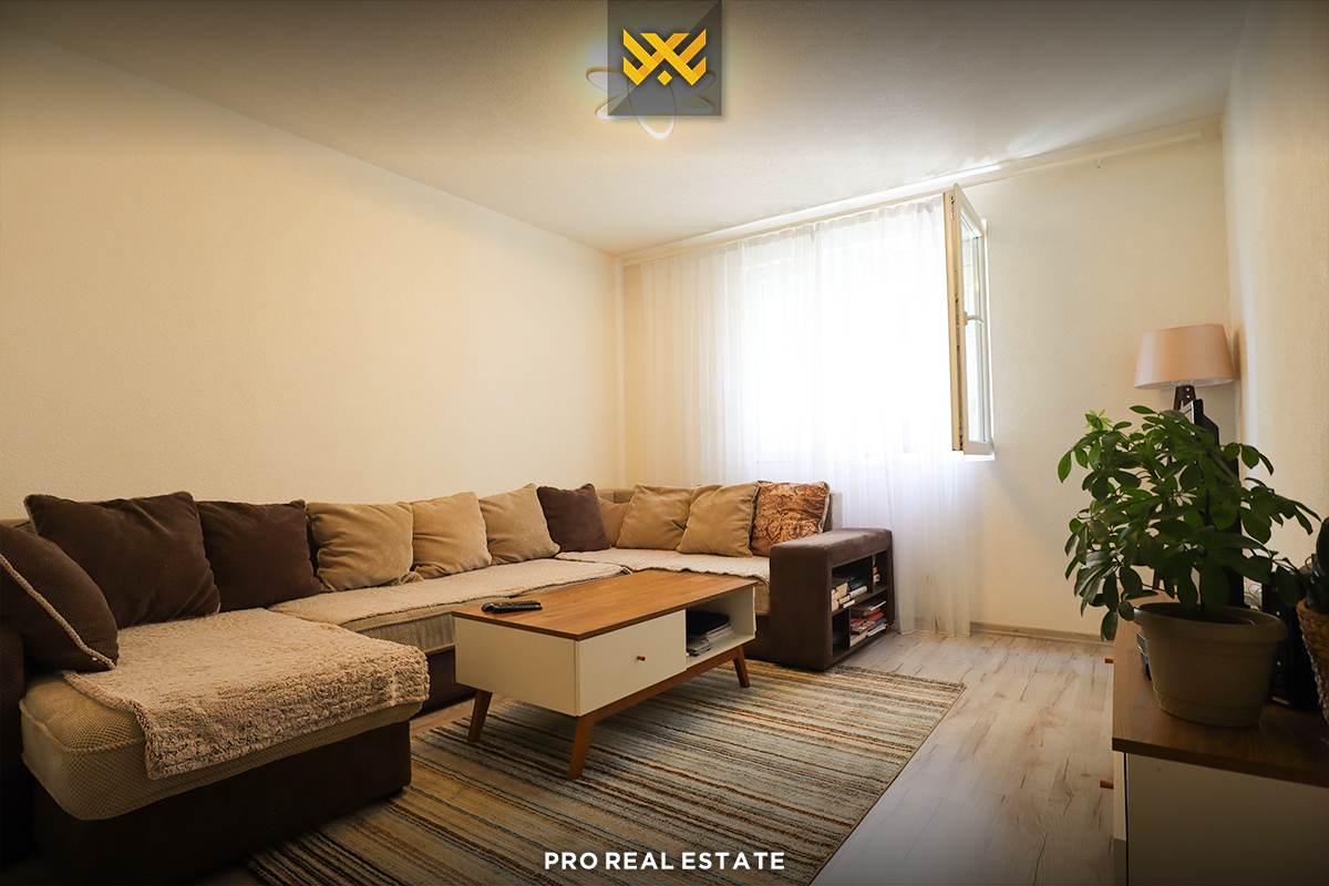It has a good orientation from the west and south, with this orientation of the interior spaces: living room, kitchen, one bedroom, one bathroom, and a storage room.