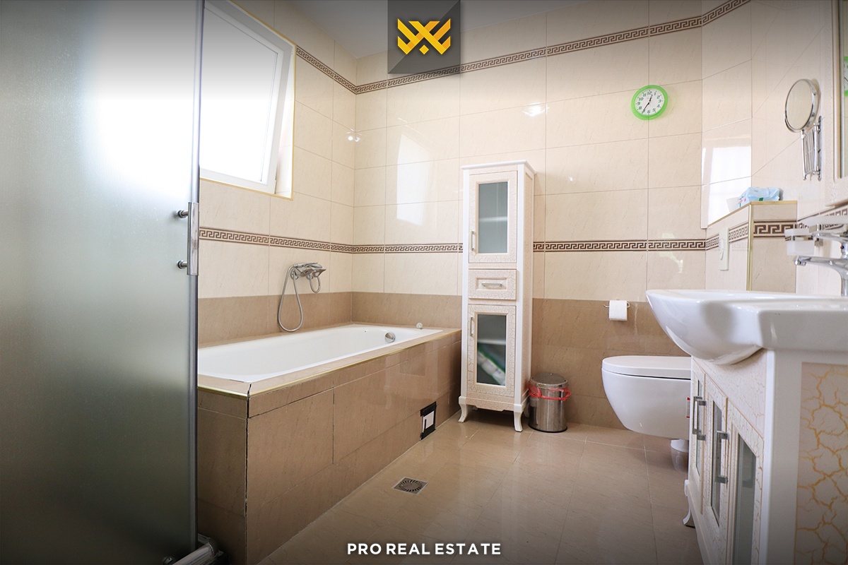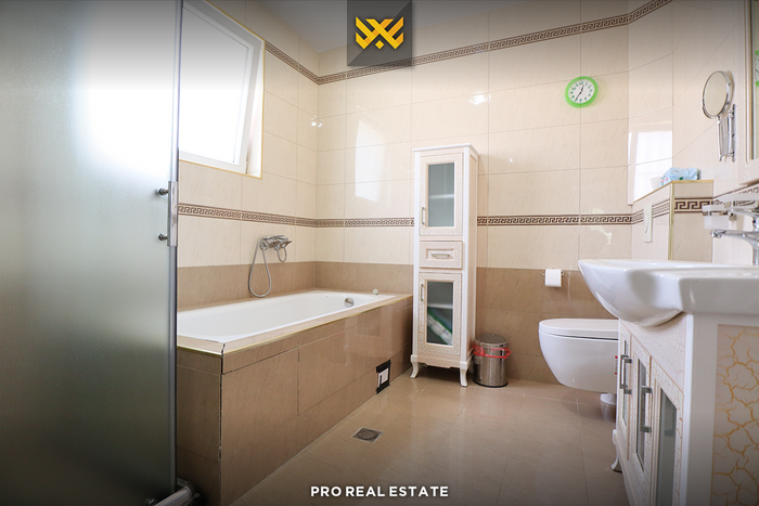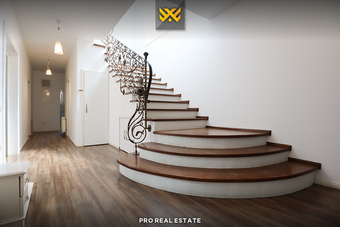 The house has a good orientation from the east and west, divided into a basement, ground floor, and one upper floor, with the following arrangement of interior spaces: in the basement, there is a usable space; on the ground floor, there is a living room, kitchen, one bedroom, and a bathroom. On the first floor, there are three bedrooms, two bathrooms, a laundry room, and a storage room.