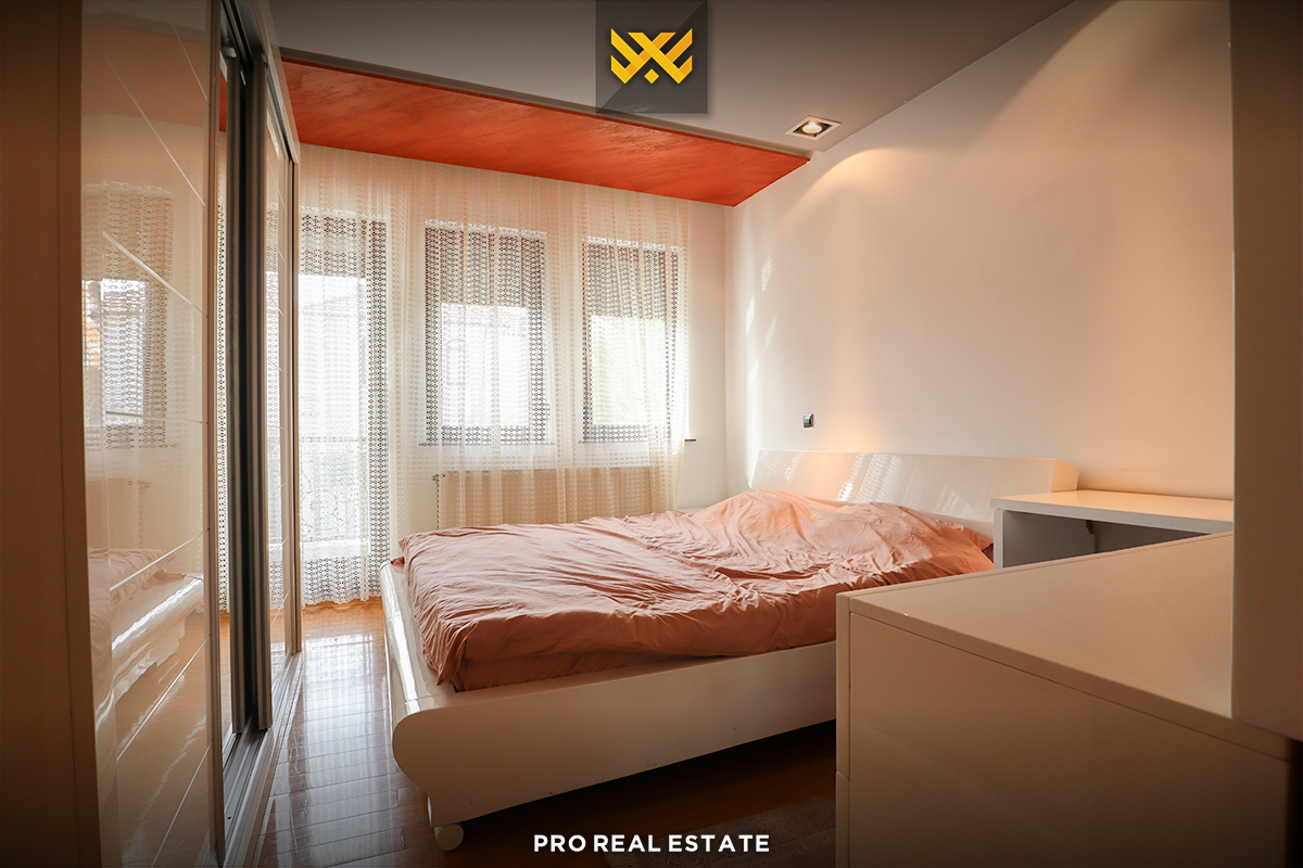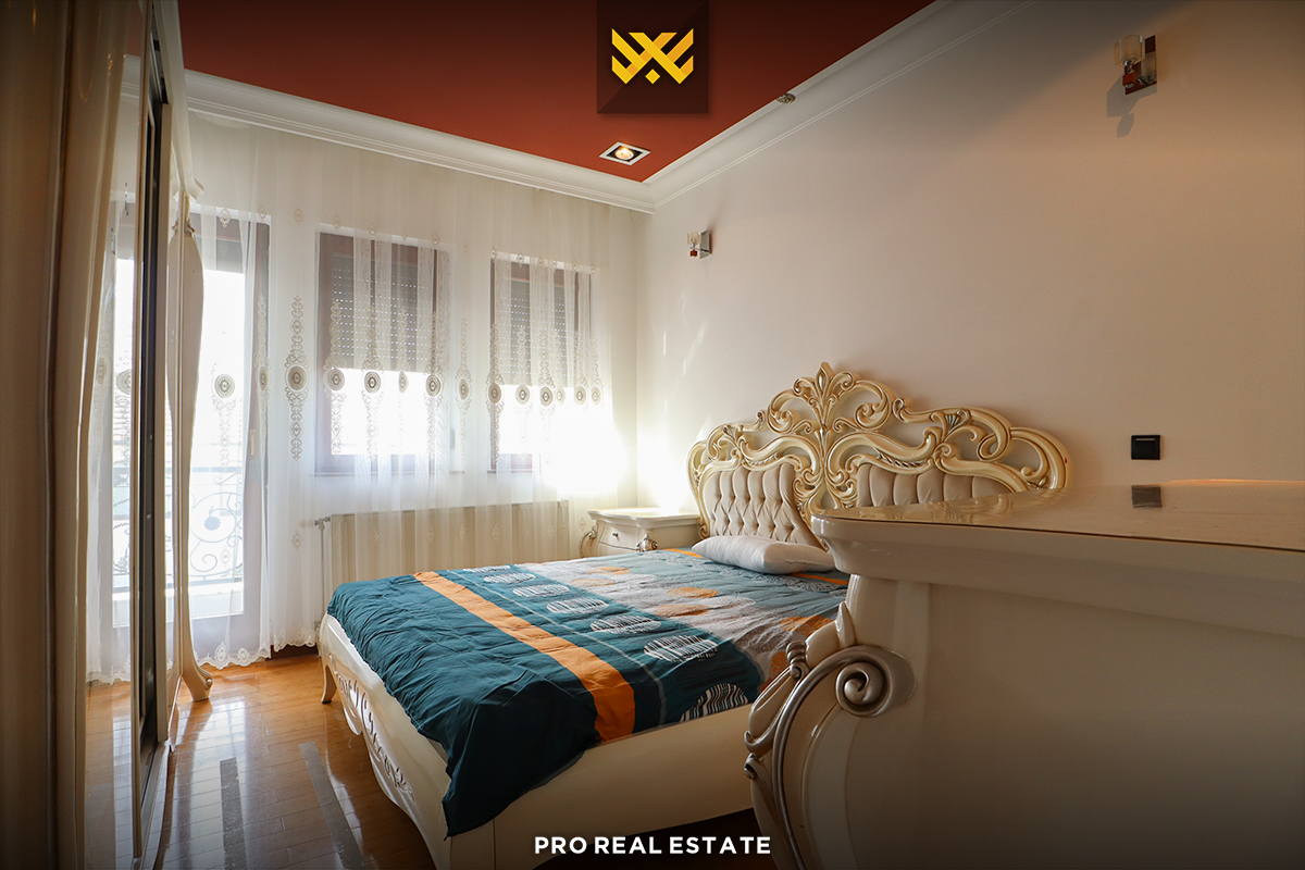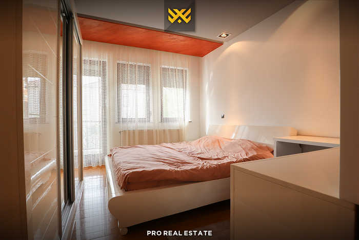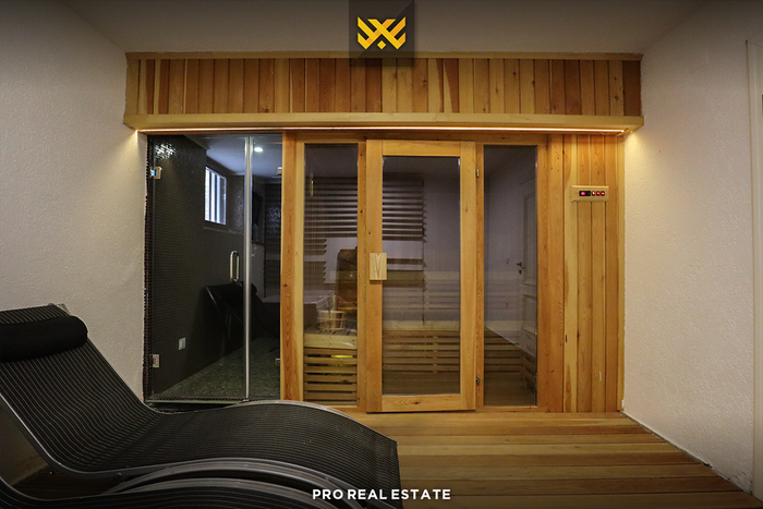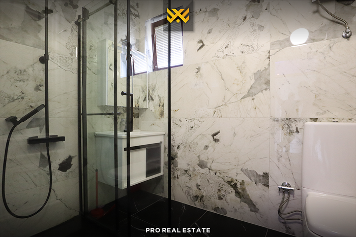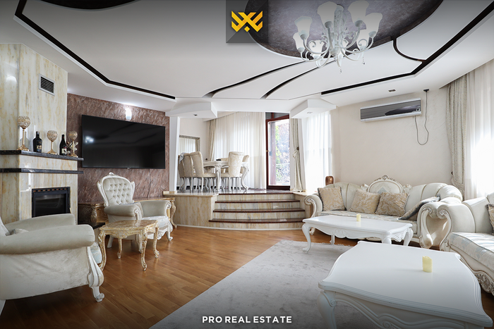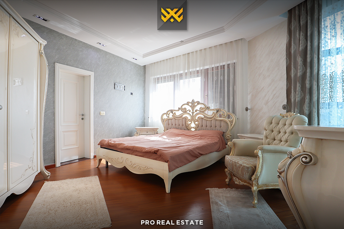The house has an ideal orientation from all sides, is divided into three floors, and has the following arrangement of internal spaces: the ground floor has a living room with kitchen, a master bedroom, and a terrace. The first floor has four bedrooms (one with a separate bathroom), a bathroom, a wardrobe, and a terrace, while the second floor has a cinema, mini bar, spaces with jacuzzi, and relaxation area. The house also has a basement where there is a sauna room, a wardrobe, fitness space, a mini kitchen, and a toilet.