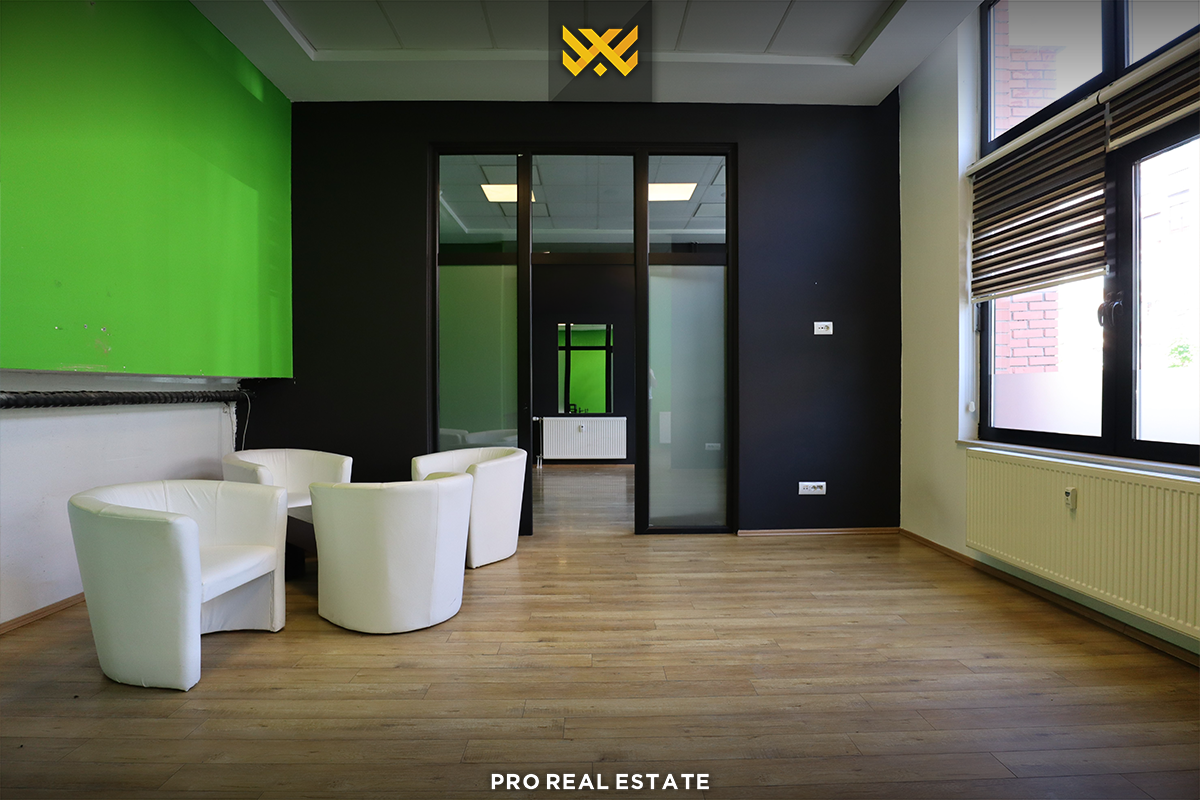 The space has a west orientation and is offered on two levels, the ground floor with a height of up to 5.5m and the first floor with a height of 2.7m, featuring two usable workspaces, a kitchen, and a bathroom.
