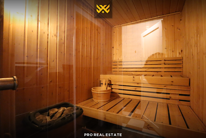 The basement includes a pool with a jacuzzi, sauna, bathroom, changing rooms, gym, and utility room;