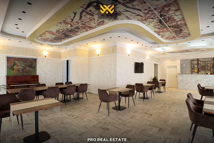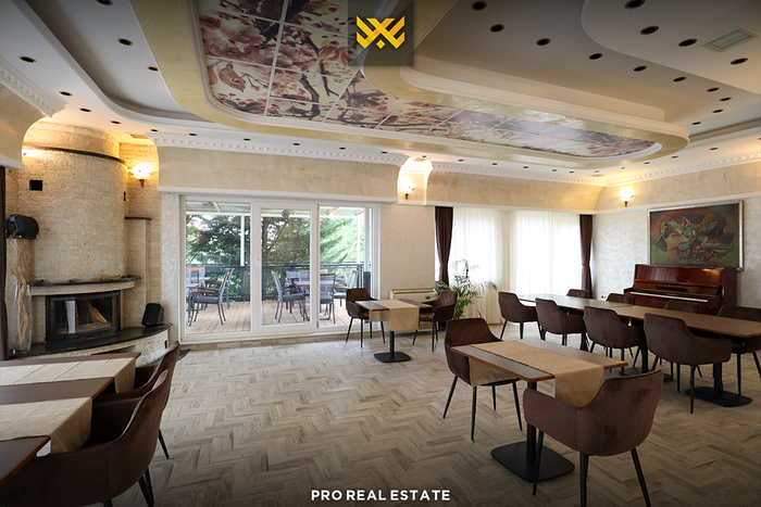 On the ground floor, there is a waiting area, reception, restaurant, kitchen, a bedroom with a bathroom, a bathroom, and a veranda;
