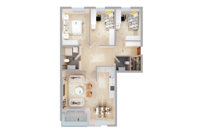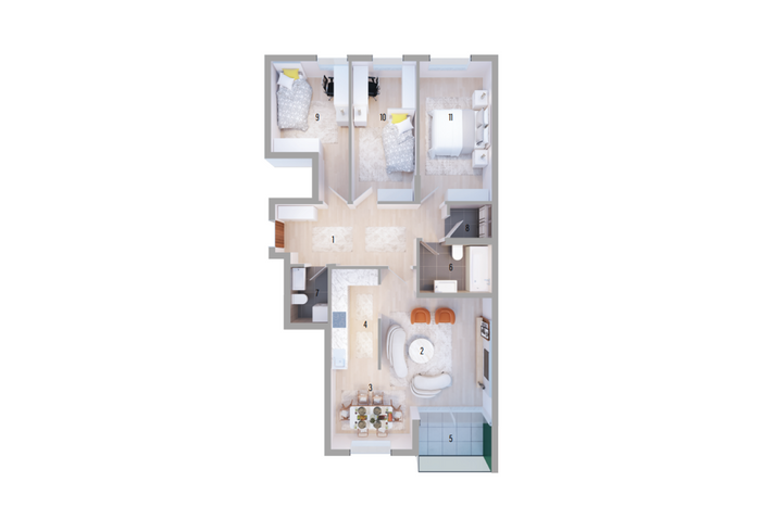 The apartments are oriented to the east and have the following layout of internal spaces: living room, kitchen, three bedrooms, one bathroom, one toilet, storage, and balcony.